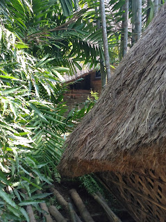 | Staris going up is a drain network. The little thatched roofs are the prasadam honoring area, the bigger one with the little one on top is the cooking area. |